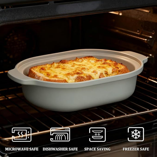 MAGNIFIQUE Casserole Dishes for Oven, 9x12 Porcelain Baking Dish, 4 Quarts Lasagna Pan with Handles and Lid, Oven Safe up to 500°F or on Stovetop, Use to Marinate, Cook, Bake, and Serve, Olive