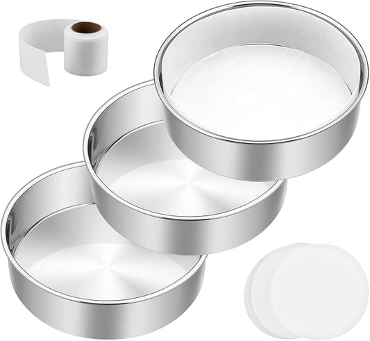 8 Inch Cake Pan Set of 3, E-Far Stainless Steel Round Layer Cake Baking Pans with Parchment Rounds & Side Liner Roll, Non-Toxic & Healthy Metal Cakes Tin, Straight Side & Dishwasher Safe