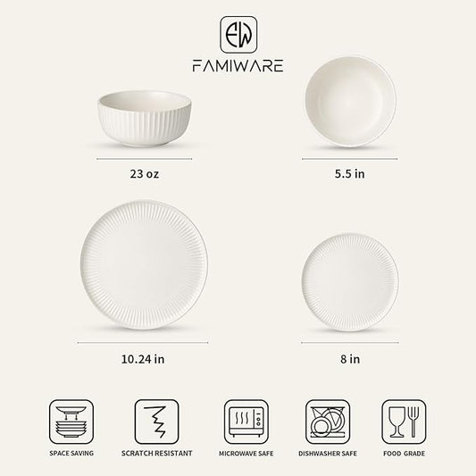 Famiware Starlight Dinnerware Sets, Plates and Bowls Dish Set of 4 (12 Pieces), Ribbed Textured Tableware - Dishwasher & Microwave Safe, Chip Resistant, Reactive Glaze, Matte Reactive White