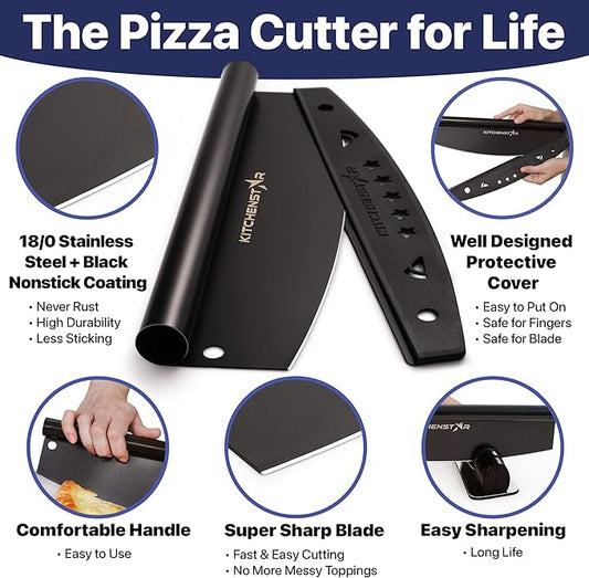 KitchenStar 12-Inch Pizza Cutter Rocker Blade - Sharp Stainless Steel Slicer Knife, Protective Cover, Black Nonstick, Small - Professional Pizza Oven Accessories
