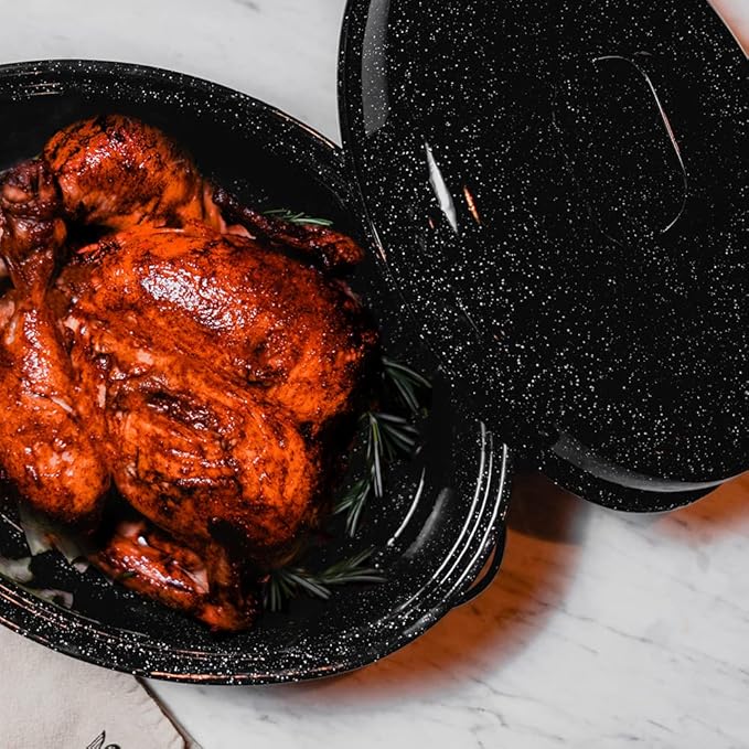 • Durable Enamel Construction: Made with speckled black enamel on steel, this roaster is designed to withstand high temperatures while remaining durable. It resists chipping and scratching, making it ideal for regular use.