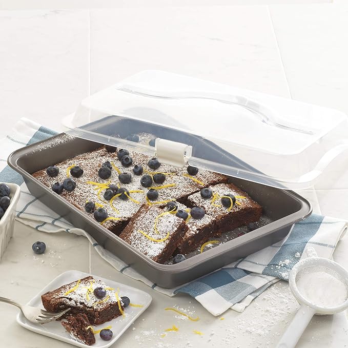 • BAKE-N-TAKE LID: Coordinating clear plastic lid allows you to bake and transport desserts all in one pan, and the fold-down handle allows for one-hand carrying