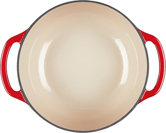 • EASY TO COOK AND CLEAN: The porcelain enameled interior has a smooth finish that minimizes sticking, promotes caramelization and resists staining. Although enameled cast iron is dishwasher safe, hand washing with warm soapy water and a nylon scrub brush is recommended to keep your Dutch Oven in tip top shape!