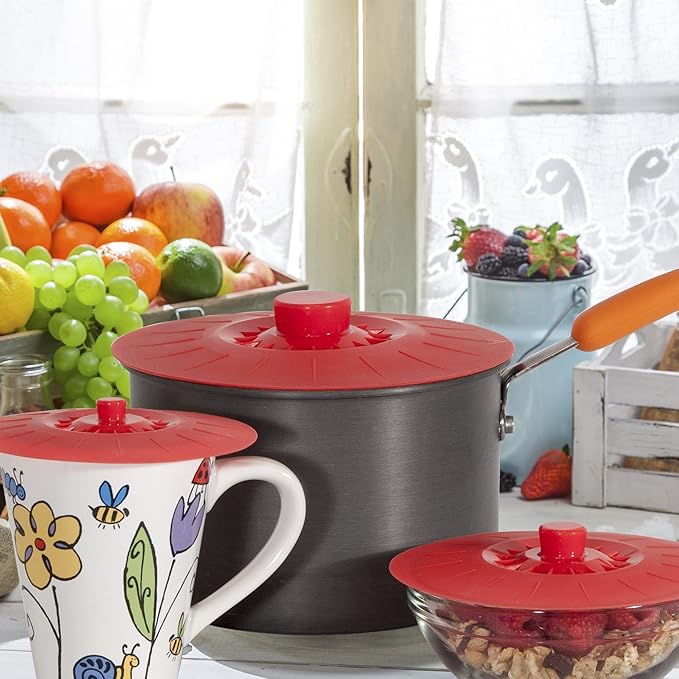 • YOU'LL LOVE HOW HANDY THESE ARE - Use them in the microwave, oven, stove top, to store in fridge, or serve food at the table. Our lids will fit most of your smooth rimmed containers including stainless, metal, plastic and glass up to 10" for mugs, pots, pans, glasses and bowls. 100% Satisfaction Guarantee