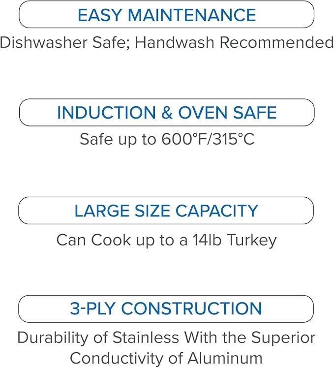 - DURABLE DESIGN FOR EFFICIENT COOKING: Our roasters feature a durable 3-ply construction consisting of a non-reactive 304 stainless steel interior, aluminum core, and induction capable stainless steel exterior which delivers even heat distribution, and the oval shape promotes a convection effect to heat food more quickly; our broiling pan is oven friendly and compatible with gas, electric, ceramic, halogen, and induction, and heats up to 600 degrees F (315 degrees C)