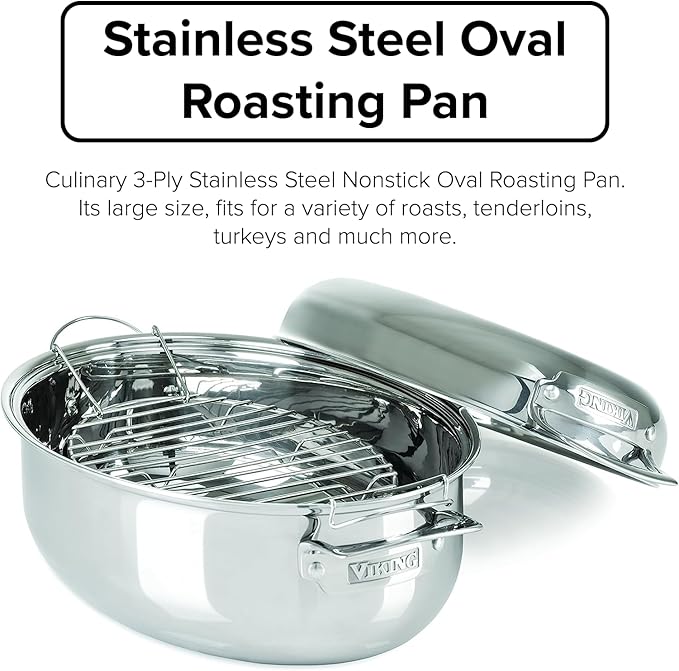 Viking 3-Ply Oval Roasting Pan, 8.5 Quart, Stainless Steel Kitchen Cookware with Metal Induction Lid and Rack, Great for Turkey, Dishwasher and Oven Safe, Silver
