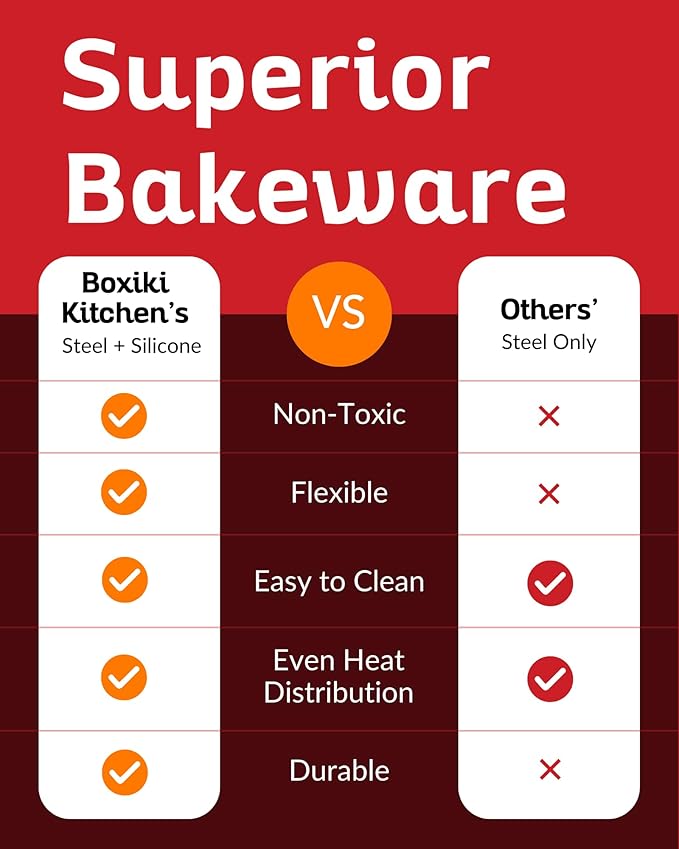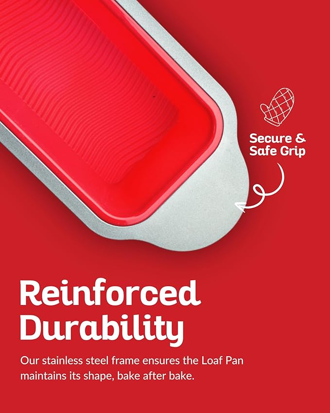 • NON-STICK SILICONE – This 9x5 loaf pan features a textured surface for easy release, simple cleanup, and dishwasher safety. Made from food-grade red silicone, BPA-free, safe for oven and freezer use