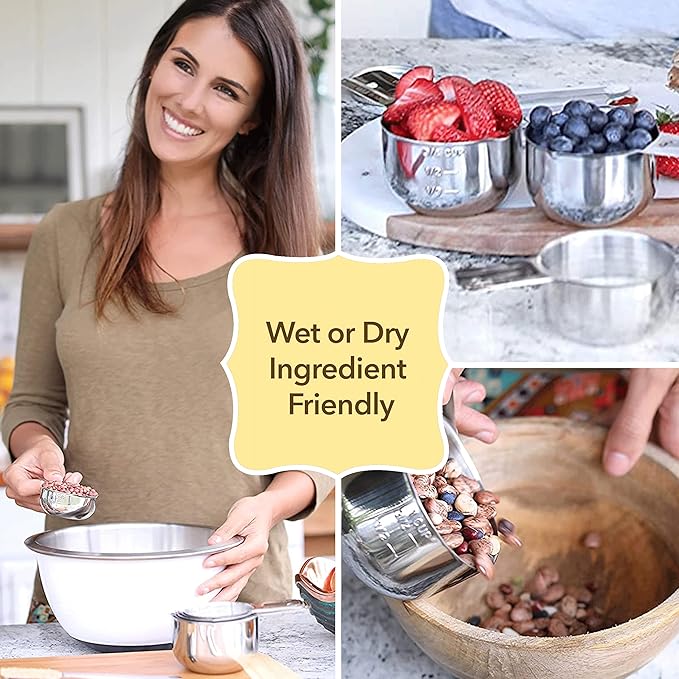 • Rust-Resistant: Don't let your cooking skills or accessories get rusty! Each stainless steel measuring cup in this set is totally rust-resistant and built for stress-free cleanup.