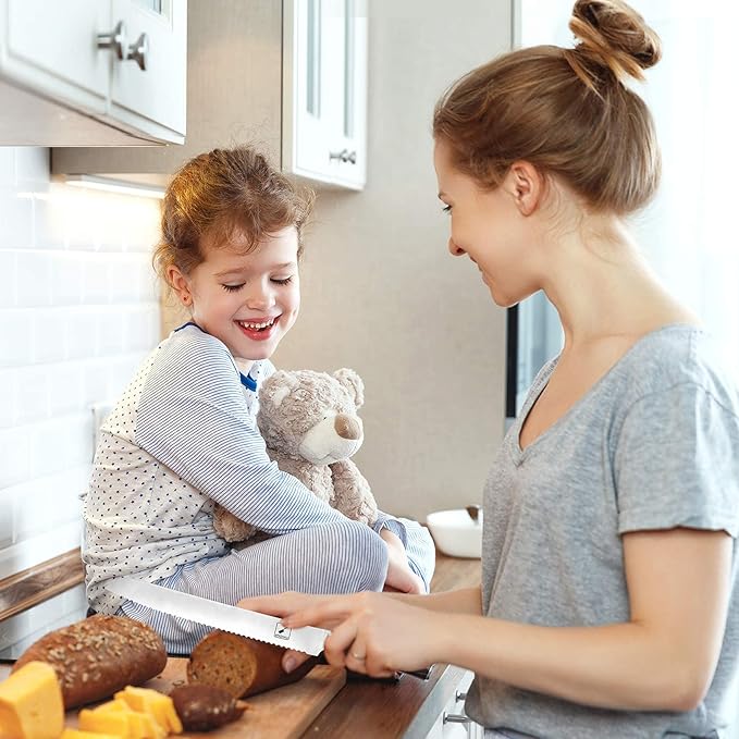 • Ergonomic Wood Handle: The shape of the bread knife handle conforms to the ergonomic design which improves the comfort of the grip during actual use. Moreover, it can make user feel easier to cut bread slices; avoiding stuttering; making your kitchen work better. Plus, our bread knife is left-hand friendly