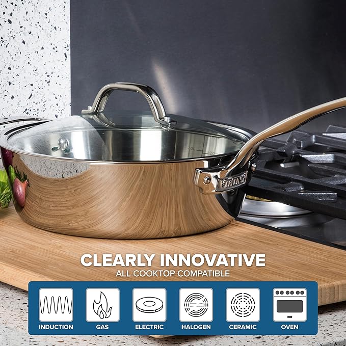 • 5 PIECE COOKWARE SET: Elevate your home kitchen experience with our Viking 5 Piece 5-Ply Stainless Steel Cookware Set! Ideal for both novice chefs and seasoned chefs, this pot and pan set includes a 10 inch frying pan, 6 qt stock pot with lid, and 3.4 qt everyday pan with lid to provide everything you need to create a culinary masterpiece