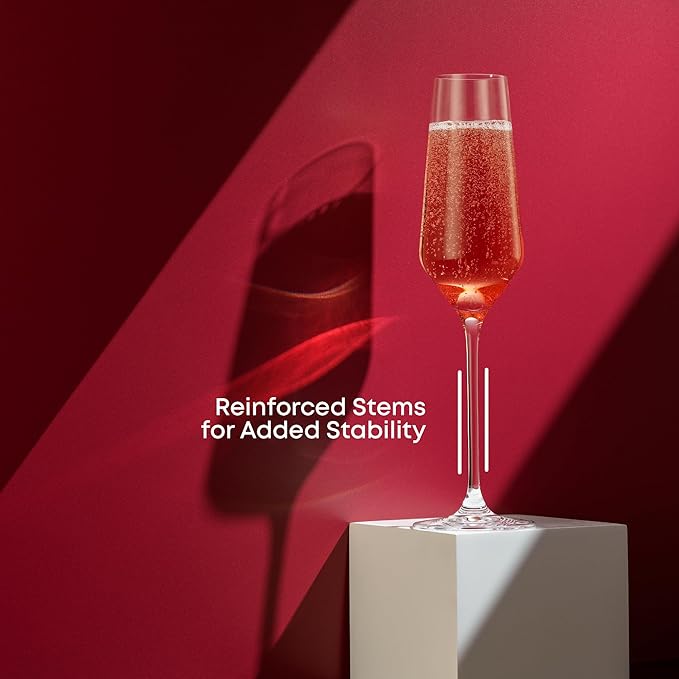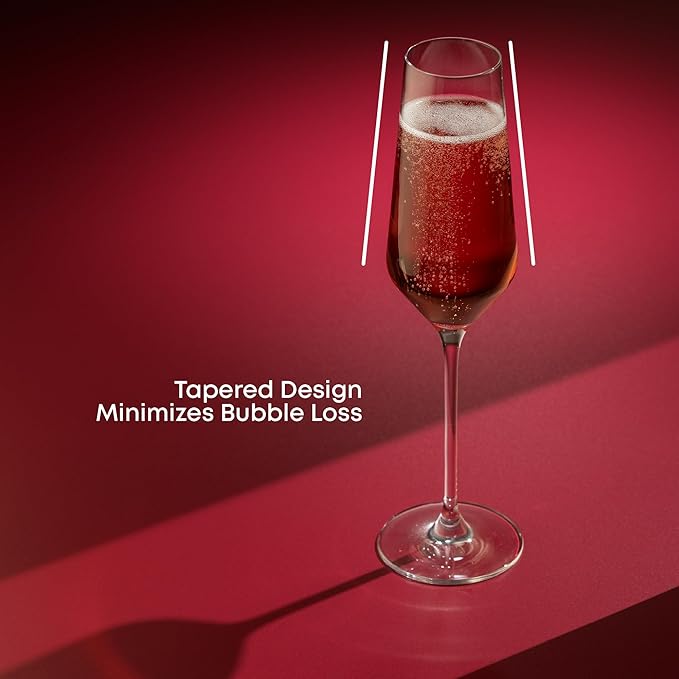 • UNIQUE DRINKING EXPERIENCE: These crystal glasses have an ergonomic design with reinforced stems for added stability, plus uniform rims which provide a comfortable drinking experience. The tapered design of the bulbs is meant to minimize bubble loss, allowing you to enjoy your favorite drink for longer!
