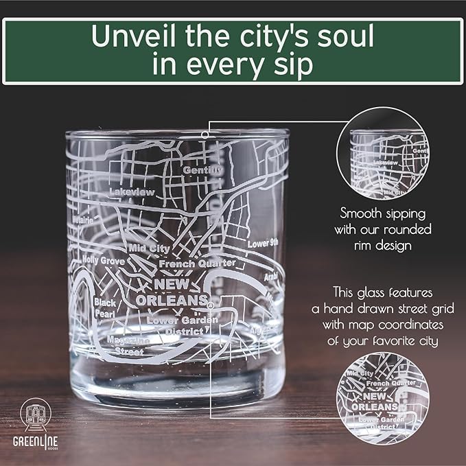 Greenline Goods Whiskey Glasses - 10 Oz Tumbler Gift Set for New Orleans lovers, Etched with New Orleans Map Old Fashioned Rocks Glass - Set of 2