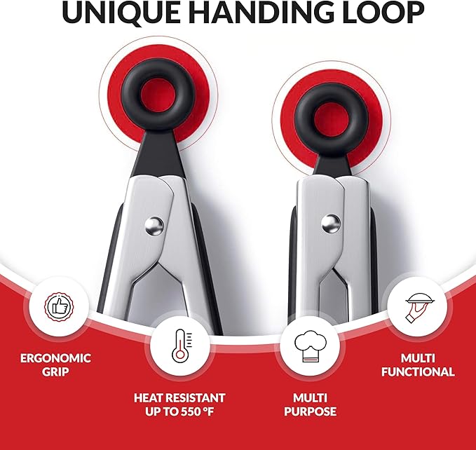 • EASY TO STORE: These kitchen tongs have locking mechanism, pull the ring for lock and push for unlock, super easy operation. Hang them with the hanging loop after use or put in the drawer by pulling the ring to lock it, space saving.