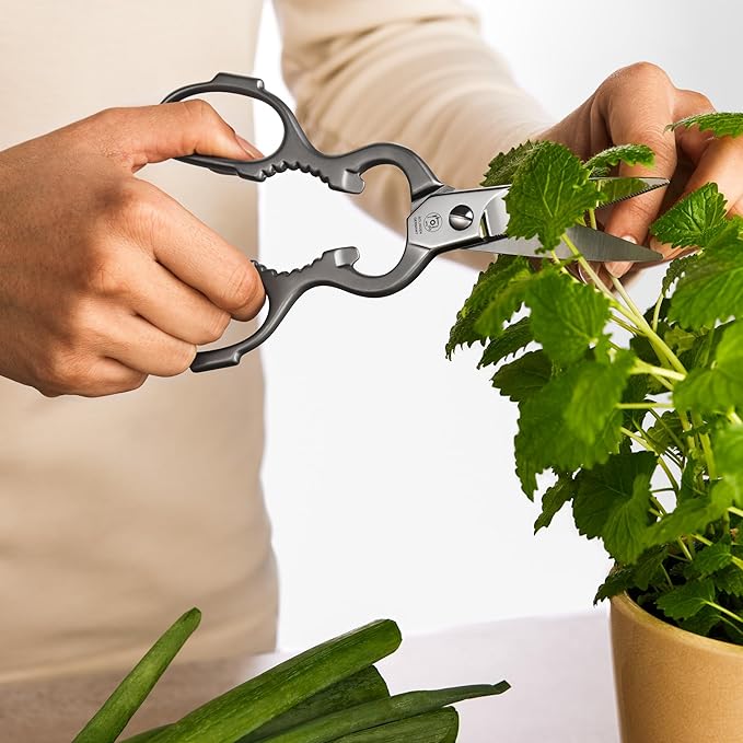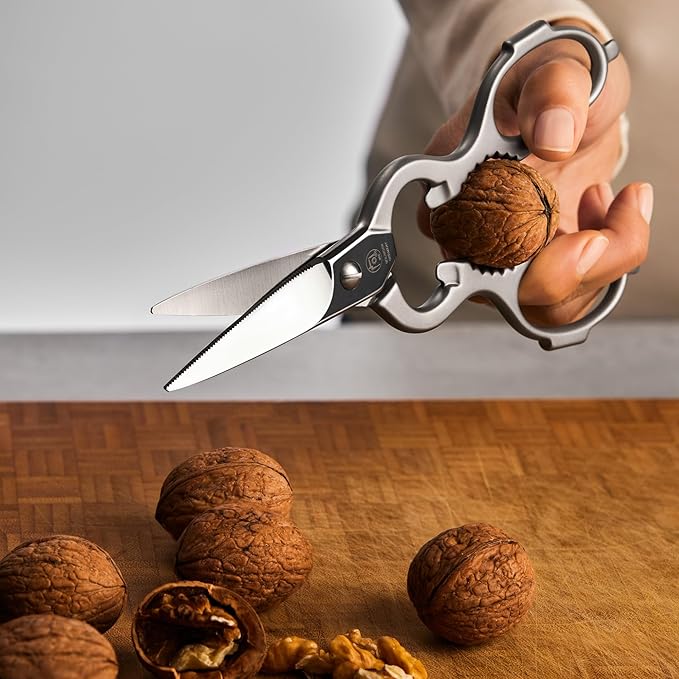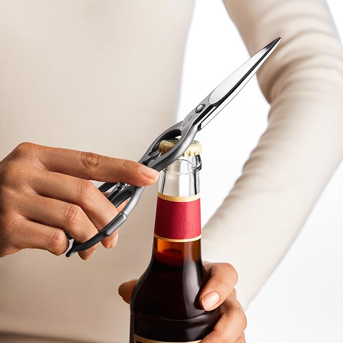 • Multifunctional Utility Scissors - The scissors heavy duty handles feature 4-in-1 essential home and kitchen tools. Instead of buying different kitchen tools, use the scissors’ built-in bottle opener, nutcracker, lid lifter, and screw cap opener.