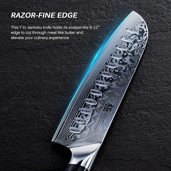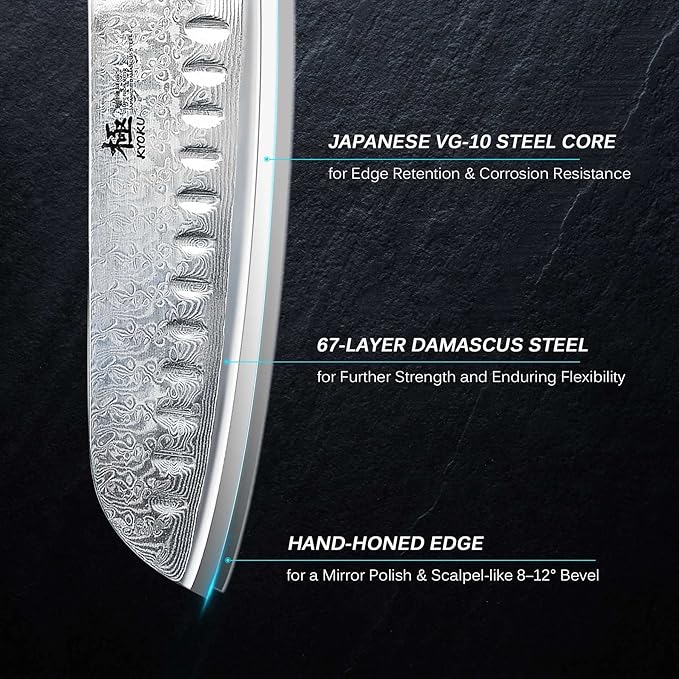 • VG-10 JAPANESE SUPER STEEL - Manufactured with ultra-sharp VG-10 Japanese Damascus steel cutting core at HRC 58-60 hardness, this 7 in. crafted culinary chef comes with unrivaled performance and incredible edge retention; cobalt added VG-10 steel outperforms AUS-10 steel in durability and is easier to sharpen as cobalt enhance the other alloying elements.