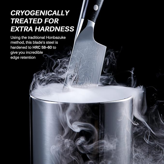 • SUPERIOR SHARPNESS - Ruthlessly sharp scalpel-like edge is handcrafted by seasoned artisans to a mirror polish at 8-12° double side using the traditional 3-step Honbazuke method; Nitrogen cooled for ultimate hardness, flexibility and corrosion resistance performance.