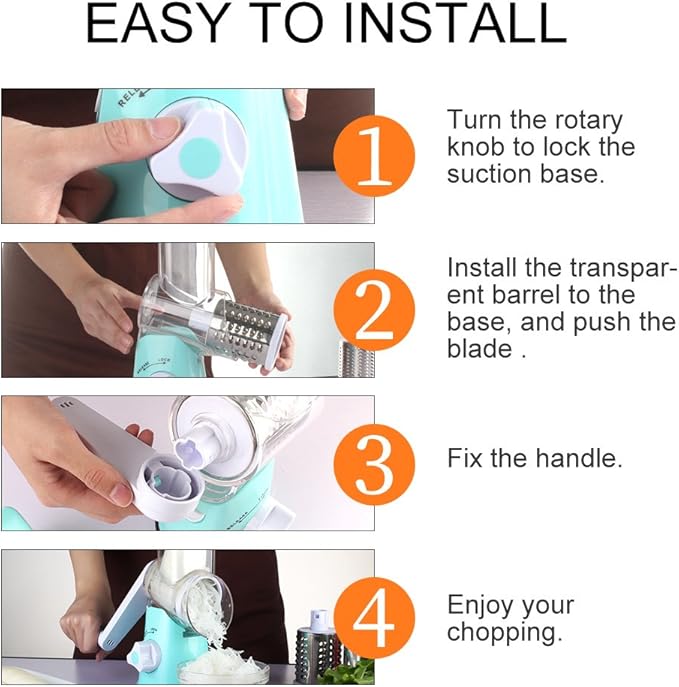 • Three blades for various kitchen needs: slicing, coarse shredding and fine shredding. The rotary grater is ideal for grating cheese, potato, carrot, cucumber, radish, nuts, chocolate, broccoli, etc. for pizza tops, cauliflower rice, hash brown and so on