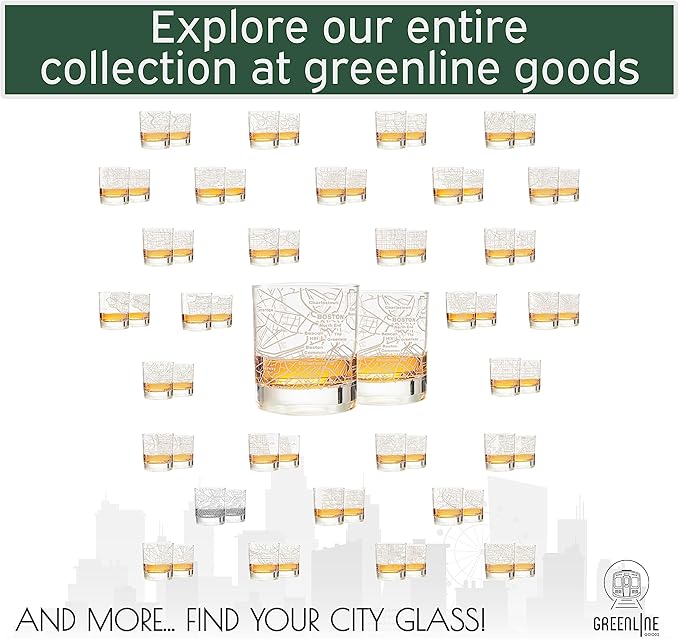 • Sand etched whiskey tumbler: Each Greenline Goods rocks whisky glass was etched by a skilled artisan and features a hand drawn street grid with map coordinates. Glass sets are carefully packed in an elegant gift box and chosen to make a lasting impression!