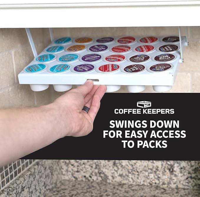 • [SPACE-SAVING UNDER CABINET K-CUP HOLDER] Keep your countertops and cabinets clutter-free with this innovative under cabinet coffee pod holder. Designed to hold up to 24 K-Cup pods, it swings down for easy access and stores discreetly out of sight when not in use. Perfect for small spaces or as an RV cabinet organizer.