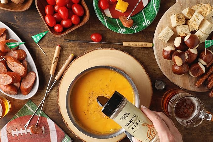 • Make space in your cupboards next to the salt and pepper shakers for The Melting Pot’s Garlic & Wine Seasoning. Two culinary ingredients – garlic and wine, make this versatile seasoning a must-have for every kitchen. This irresistible seasoning takes your favorite foods to the next level, including chicken, salads, pizza, shrimp and burgers. Want to really take things up a notch? Try this seasoning on popcorn, scrambled eggs, tacos and homemade cheese fondue.