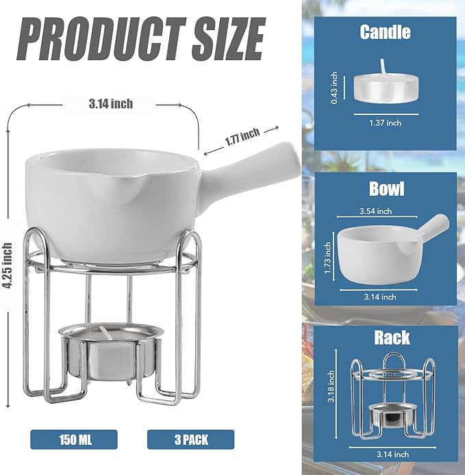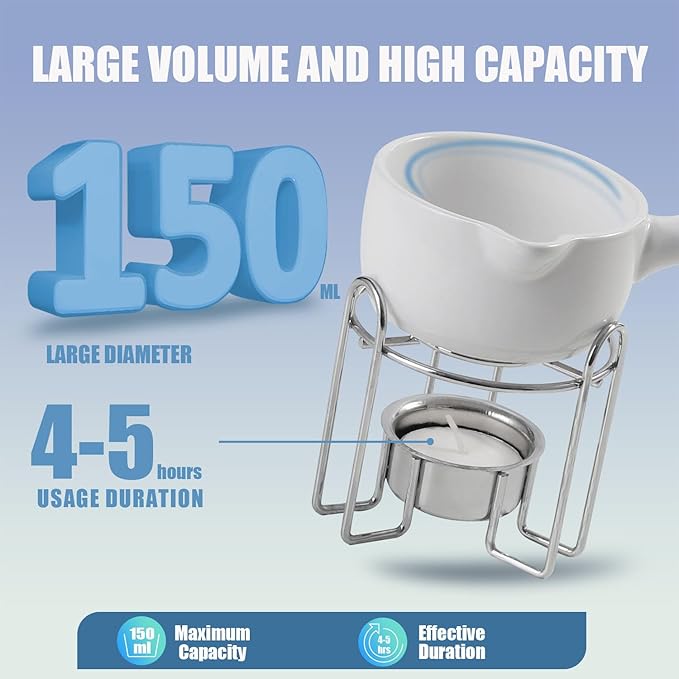 - BIGGER CAPACITY - Our butter warmers have an adequate capacity of approximately 5.1 oz/ 150 ml, large enough to hold a decent amount of anything, making them a nice portion for lobster crab. The candles and metal stands have the ideal dimensions, about 1.37 x 0.43 inches for the candles, and about 3.14 x 3.18 inches for the stands, offering a practical and compact design, durable for long-term use. Fancy enough to use on any occasion!