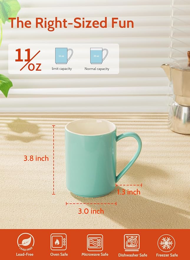 • JUST THE RIGHT SIZE: Nice feel to these ceramic coffee mugs set of 6, both in weight and materials. Perfect size, shape, and big handle, it's also great for brewing from the coffee machine. The colors are beautiful, and bright, with a bit of gloss.