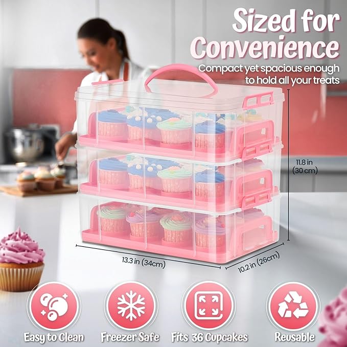 • Secure and Stackable - Cup cake carrier 3 layer tall with three trays that stack and snap together, each with 12 deep cups to safely hold up to 36 cupcakes and avoid bumps and tip-overs.