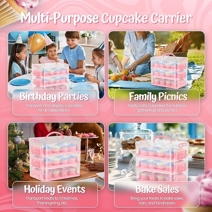 • Store and Transport - Prevent cupcake disasters and safely deliver the sweets without distorting the shape and ruining the beautiful icing of the muffins, thanks to this 3 tier cupcake carrier with lid.