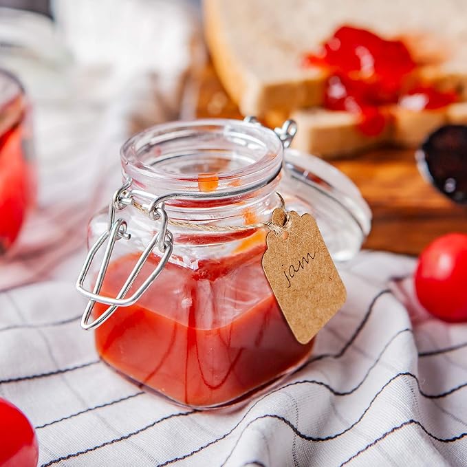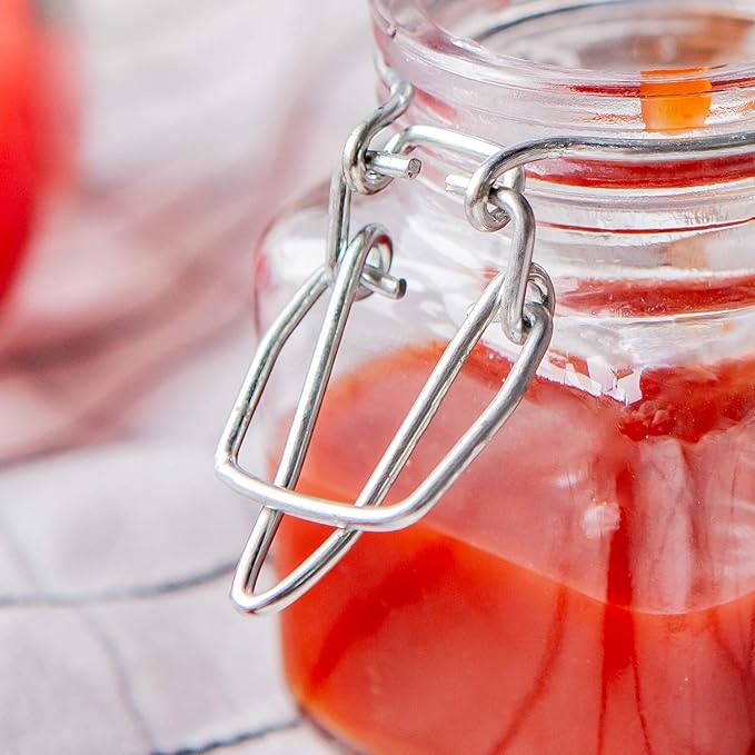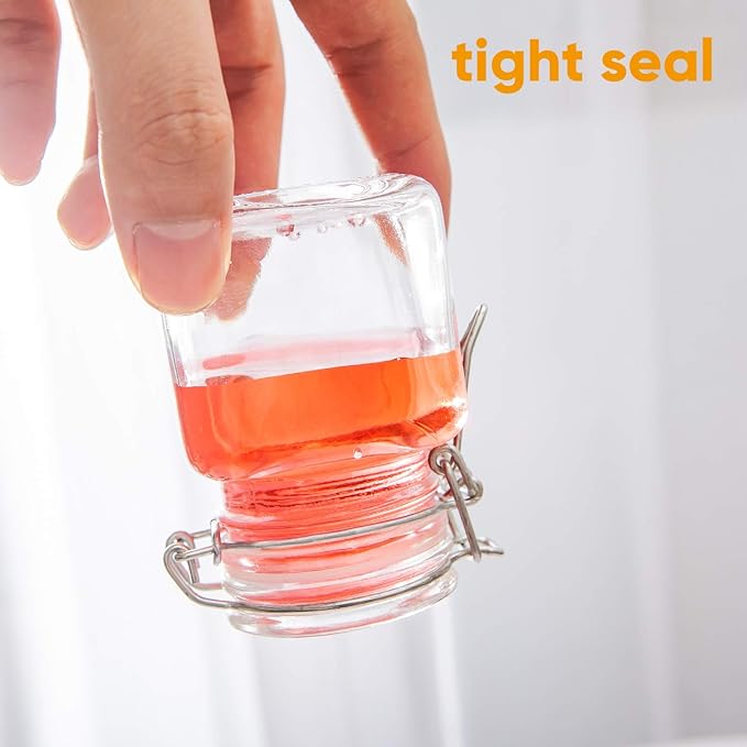 • ❤ [QUALITY STURDY CLEAR GLASS] : This set of premium quality kitchen jars is made of heavy duty scratch and shatter resistant high quality thick clear glass. Airtight 3.5 Oz Glass Jar with Leak Proof Gasket & Hinged Lid . It made of the highest quality materials for maximum durability and convenience.