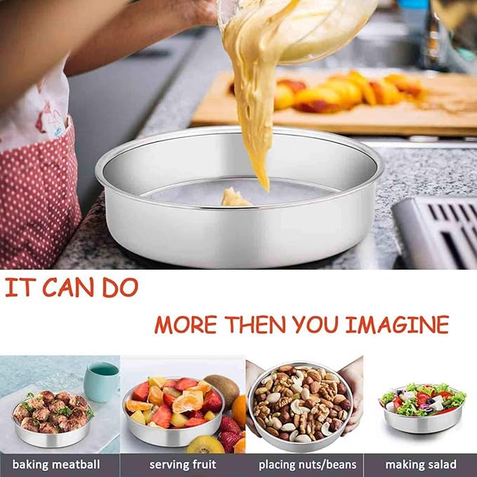 • EXQUISITE CRAFT - Mirror polished design keeps round baking pan shiny, Smooth edges without rough spots or sharp angles cutting hands, 2-inch deep rimmed sides conducive to shape cakes