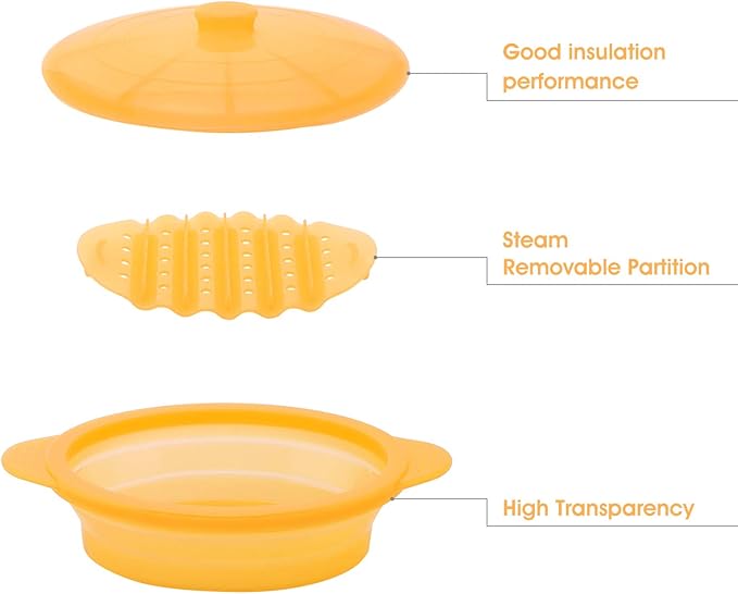 • USER-FRIENDLY - Perfect time saving and space saving tool for traveling or camping or your everyday use. Silicone steamer cookware has a lid and a detachable insert. Just put a little bit of water in the bottom, cover your food with the lid, and let microwave steamer do the rest. Also, the silicone material is easy to clean and dishwasher safe.