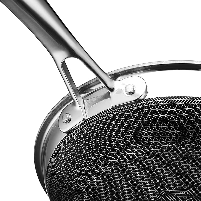• HexClad’s patented Hybrid technology features a laser-etched hexagonal nonstick surface that combines both stainless-steel and our TerraBond ceramic coating for the ultimate sear and easy cleaning.