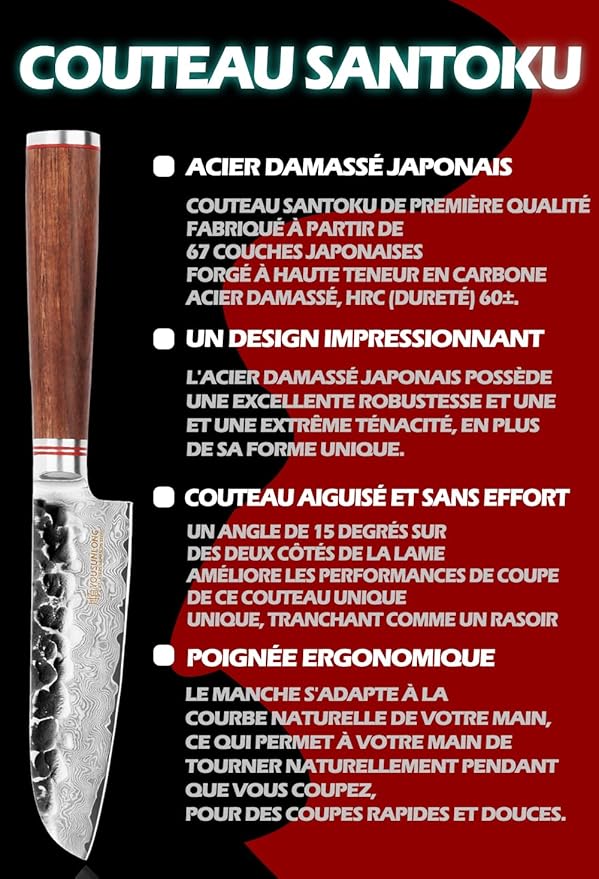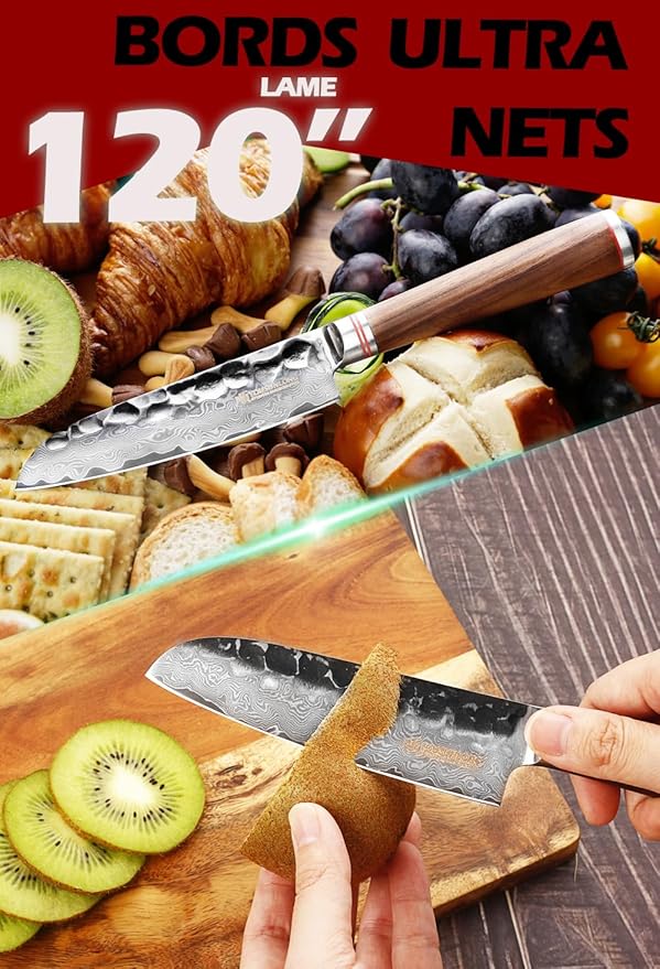 • 【Anti-Stick】Knife surface convex hull with anti-stick effect,The professional Santoku Knives has a sharp blade and a 15° blade. It has high hardness and wear resistance.In the process of use, your left and right hand can be used,meantime you can make accurate cutting and even slice, which make it easier to use.