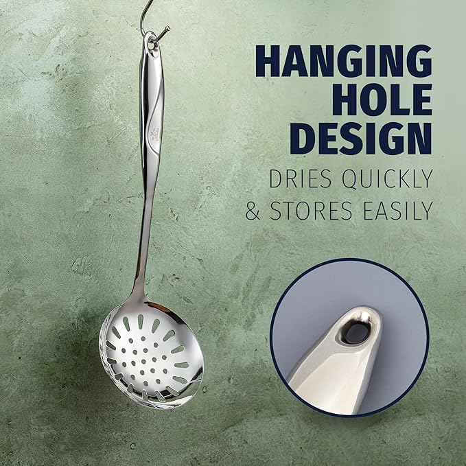 • QUICK STRAINING: This skimmer spoon can be used to scoop out blanched vegetables, boiled or poached eggs, potatoes, or strain fried onions, filter chicken stock, and even for stir frying in the wok. The perfectly proportioned slots in our strainer ladle give a great liquid flow when straining or draining food.