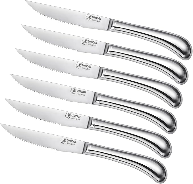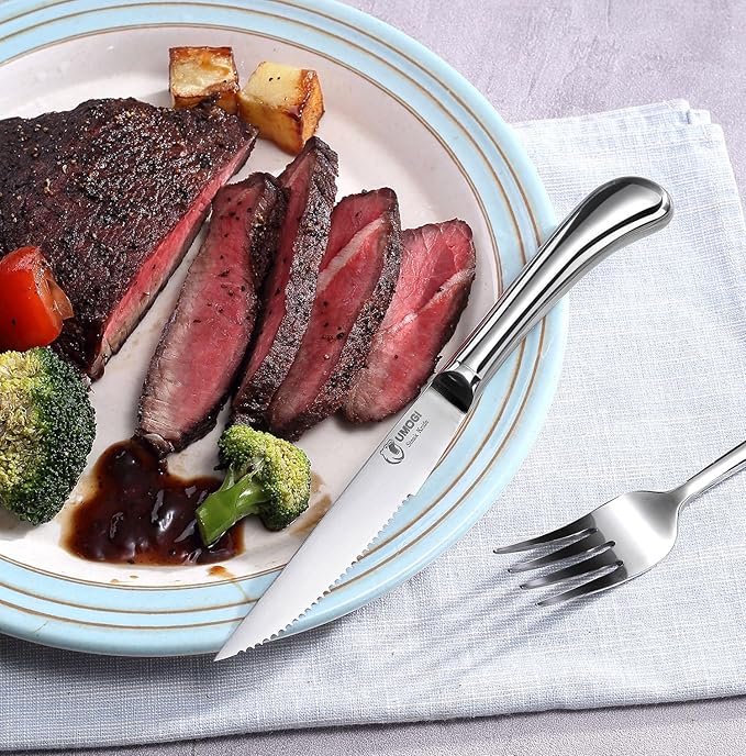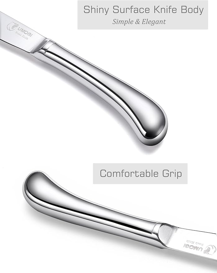 • ▶1. The UMOGI Knife Advantage: The steak knife set is made of exceptionally hard stainless steel, ice tempered and hardened to resist corrosion and rust. Premium high-carbon stainless steel ensure its exceptional strength, durability and rust-free abilities. SLEEK POLISHED BLADE & HANDLE, the ultimate high-end, avant-garde comfortable steak knives