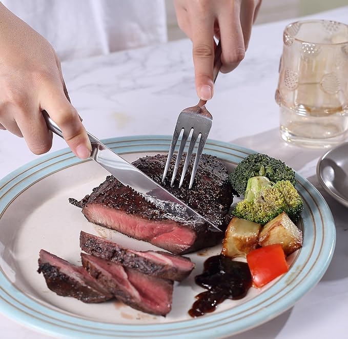 • ▶2. CLASSICAL KNIFE EDGE: Micro Serrated edge combines straight blade tips is the unique feature of our steak knife.The knife blade is forged with hand-polished edges at 14-16 degrees one side and plus superfine jagged edges,the experienced craftsmen can keep the finest cutting feeling when cutting ingredients,but also take the strength of the edge into account,maintaining a perfect balance between sharpness and maximum elasticity,thus the sharp blade for will lock the food's original nutrition.