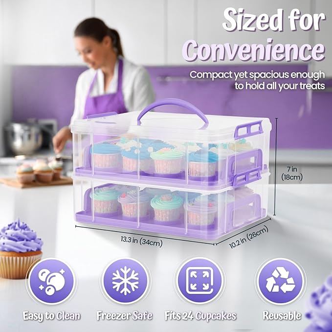 Flexzion Cupcake Carrier, Cupcake Holder for 24 Cupcakes, Portable and Reusable Rectangular Cake Carrier with Lid and Handle, 2 Tier Stackable Layer Insert (Purple)