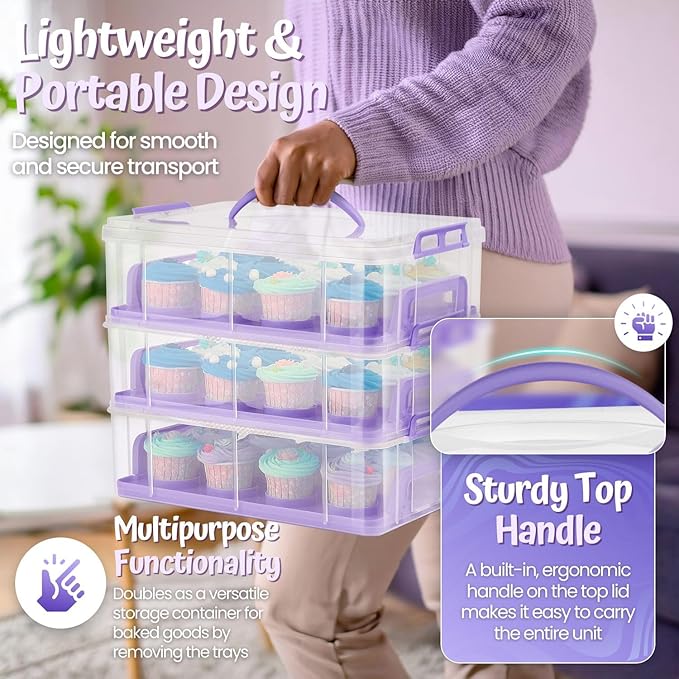 • Secure and Stackable - Cup cake carrier 3 layer tall with three trays that stack and snap together, each with 12 deep cups to safely hold up to 36 cupcakes and avoid bumps and tip-overs.