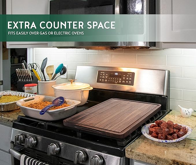 • KNIFE FRIENDLY – This all-natural board has perfect solidity and softness to prevent from blunting your knives. As with all wood cutting boards, it may show some knife marks, but when cared for properly (instructions in the box) it will preserve the rich color and last longer.