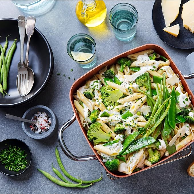 • Multi-Use Copper Chef Non-stick Pan: Scratch-resistant nonstick copper cookware pot lets you cook meat, veggies, soups, rice, pancakes & more. Square design offers 25% more cooking surface.