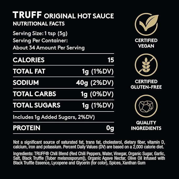 • ONLY THE BEST INGREDIENTS. With no limit to indulgence, Truff sourced its ingredients with an open mind and a sophisticated palate. Truff uses ripe red chili peppers infused with black truffle oil from Northern Italy and agave nectar from Jalisco, Mexico. It's all tied together with a hint of cumin, and of course, NO Preservatives, EVER.