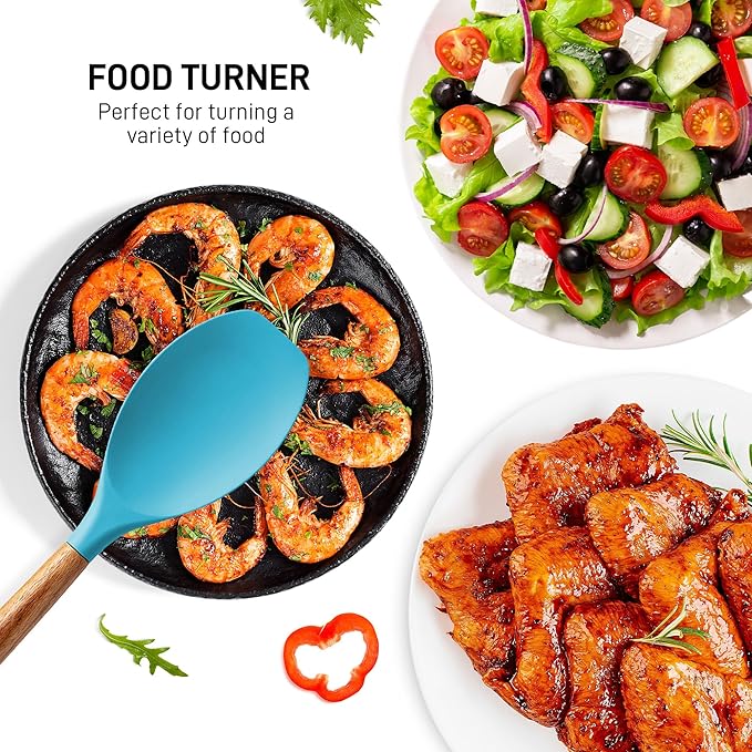 • PREMIUM QUALITY THAT LASTS: These kitchen utensils are made of food-grade silicone with a heat resistance of up to 464°F, making these ideal for stirring food in hot pans. The handles are crafted from authentic acacia hardwood, perfect for long-term use.