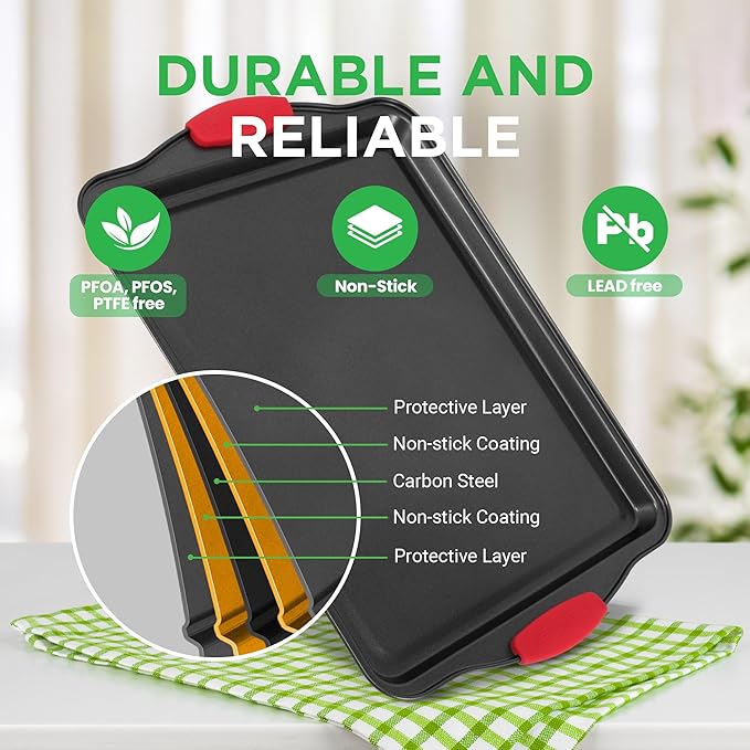 • DURABLE BAKEWARE SET: These cookie pans are made from carbon steel & non-stick coating that resists warping to keep your baking, roasting & toasting for years. It is suitable for the oven, refrigerator, and freezer. A reliable cookie sheet oven pan style