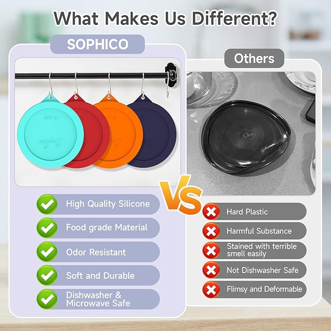 • RELIABLE SILICONE - Made from premium food grade silicone, which is odorless, non-toxic and BPA-Free. Compared with plastic lids, our silicone lids will not warp and crack over time of use.