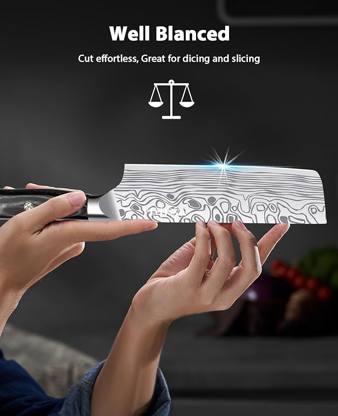 • 【Perfect Size and Weight】The standard length of the nakiri chef knife is 7-inch and is much easier to manipulate for different functions such as chopping, mincing, dicing, and slicing. Our chef's knife weighs 8.8 oz, which makes you feel more durable and effortless to cuts easily through large pieces of food.