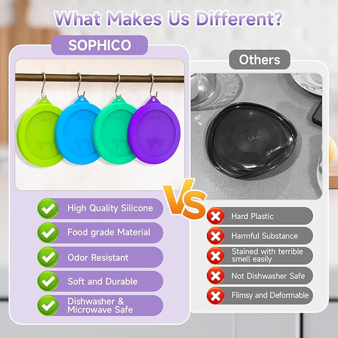 • RELIABLE SILICONE - Made from premium food grade silicone, which is odorless, non-toxic and BPA-Free. Compared with plastic lids, our silicone lids will not warp and crack over time of use.