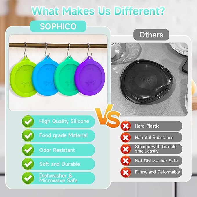 • RELIABLE SILICONE - Made from premium food grade silicone, which is odorless, non-toxic and BPA-Free. Compared with plastic lids, our silicone lids will not warp and crack over time of use.