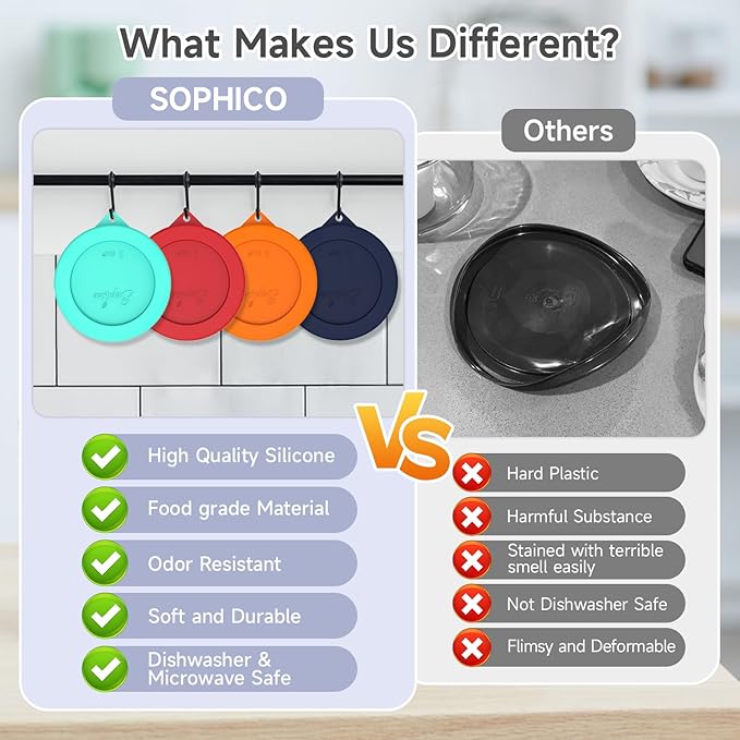 • RELIABLE SILICONE - Made from premium food grade silicone, which is odorless, non-toxic and BPA-Free. Compared with plastic lids, our silicone lids will not warp and crack over time of use.