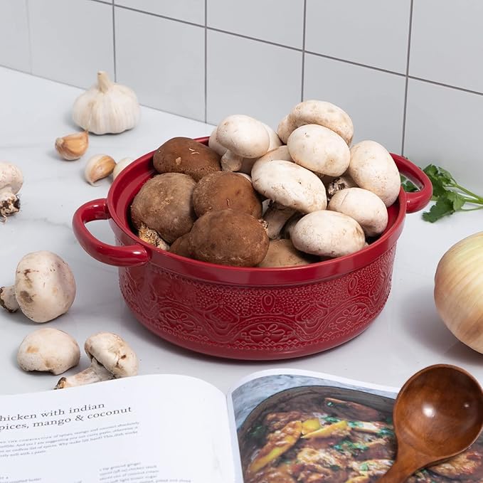 FUN ELEMENTS Casserole Dish, 2 Quart Lace Emboss Casserole Dish with Lid, Oven to Table Ceramic Round Serving Dish with Handles for Dinner and Party, Thanksgiving Christmas Gifts(Christmas Red)