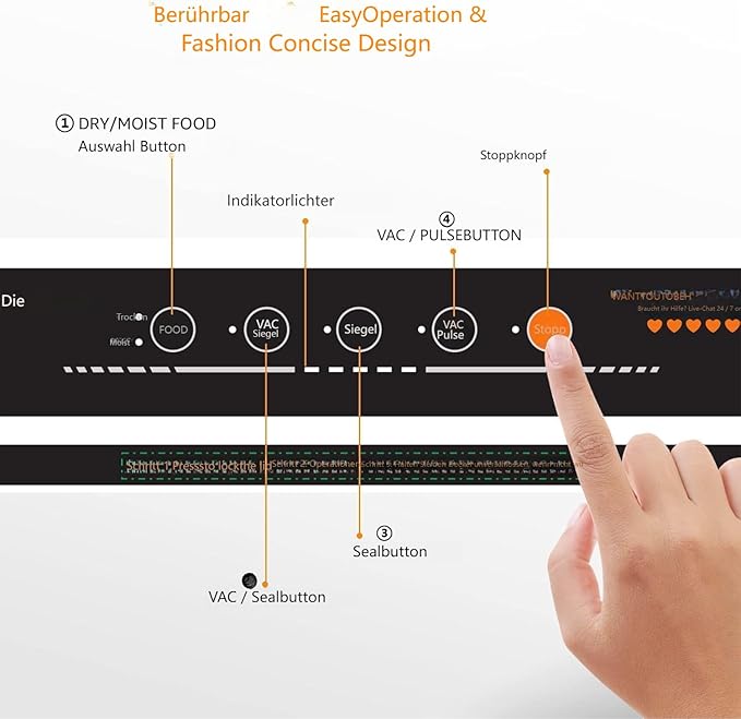 • Mega Simple – One-Touch Operation with Dual Modes: Enjoy one-touch automatic sealing in just 10-20 seconds. Choose between "Dry" mode for solid foods and "Moist" mode for poached or simmered dishes. Seal multiple bags at once with the 12-inch sealing wire, making food preservation quick and easy.